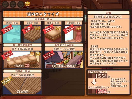 例えば床や棚の模様を増やしたり、市場で販売されてるより高い商品を開放したり等、何を開放するのかはプレイヤー自身が決めていく形になるので商品を売る楽しさが出てくると思います