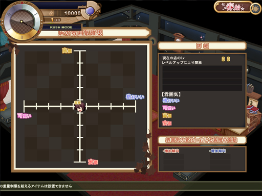 今回のデータできっちりした店内の雰囲気確認画面が実装されました。そもそも店内雰囲気とは何かって話なんですが、簡単に言っちゃうと店の内装を変化させていきその変化した内容に伴って来店するお客が変わってくるシステムです。