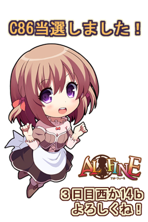 当日は現在作成中の冬完成予定のゲームALFINE(アルフィーネ)の最終開発版を100円で配布する予定です。